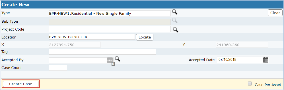 TIP: You can add a menu item to the main toolbar to easily access the Create New page using the Configure the Cityworks Toolbar in Designer Office Companion 23 Guide, or enter CWPermit/UF/Case/Page/CreateCase.aspx after your site's name in your browser's URL.