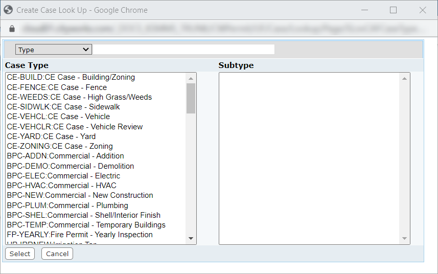 1. Begin typing in the Type field to generate a filtered list of case types, or click the CaseType Lookup icon to open a selection window.