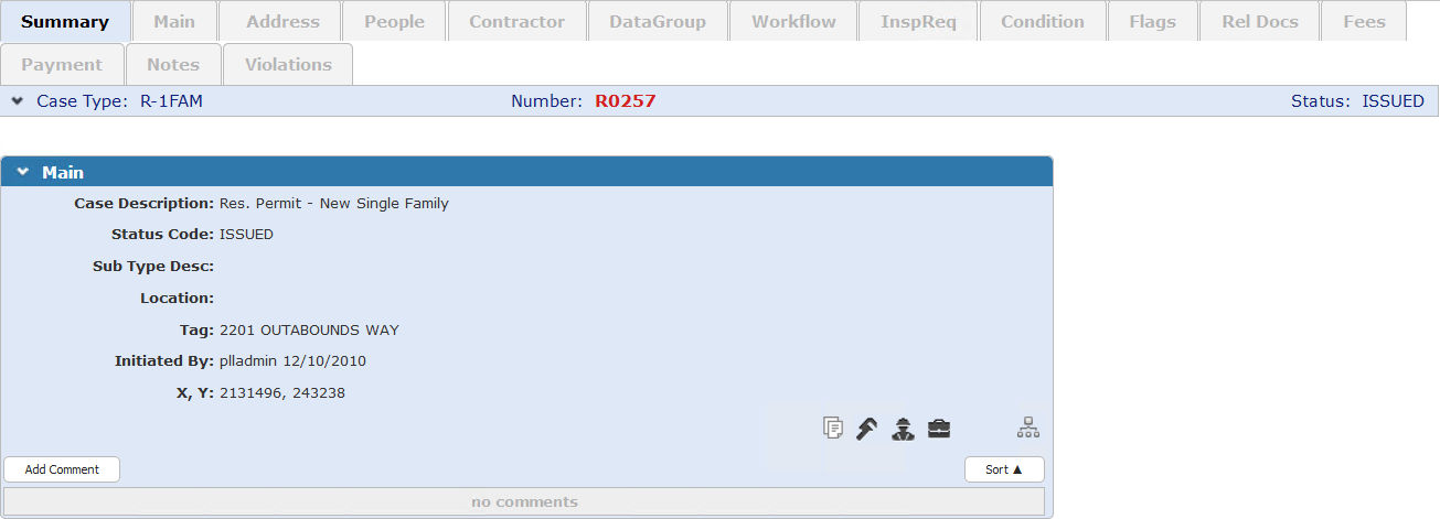 NOTE: The panel names appearing on the summary page are the default labels, but may be changed by the Cityworks administrator. The order of the panels and tabs that appear on this page may differ depending on how the PLL administrator arranged them or which case type is chosen. See Configure Controls on a Case Template in the PLL Admin Office Companion 23 Guide for more information.